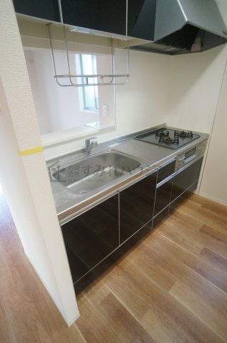 3口ガスコンロのシステムキッチンは対面式です。オシャレなアクセントクロスがリビング横の洋室に使用しており、オシャレな室内です。