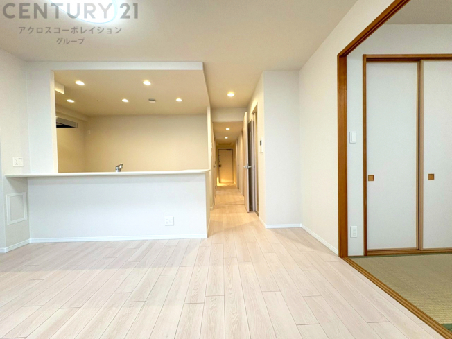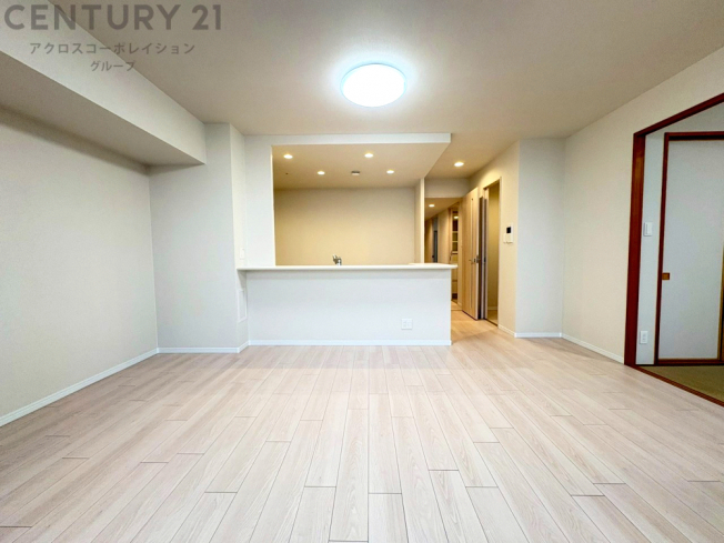 キッチン前のダイニングスペース カウンターキッチンから料理の受け渡し等に便利です。ダイニングセットを置いても十分な広さを確保。