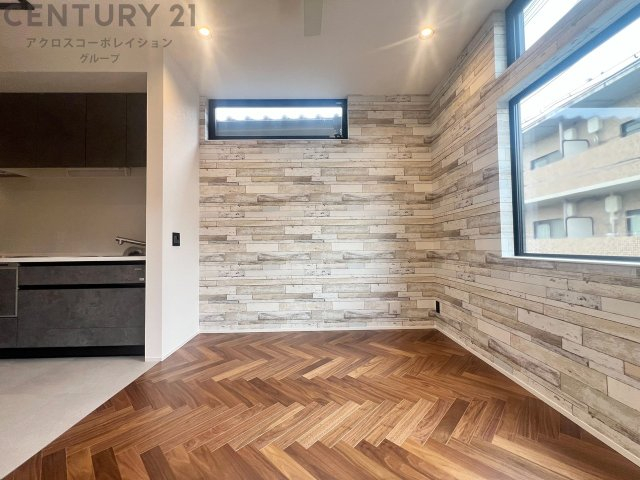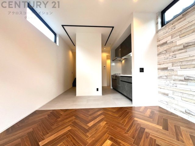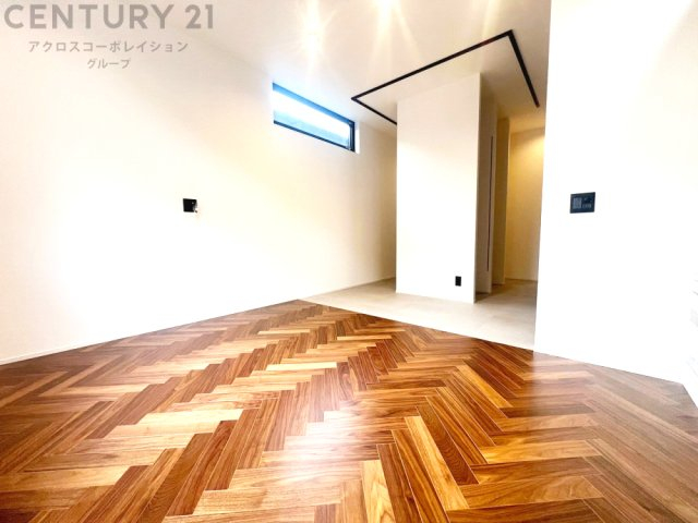 大きな採光窓から光が差し込む、明るく開放的なリビング。ヘリンボーンの床材が上質な雰囲気を添え、日々の暮らしを心地よく彩ります。