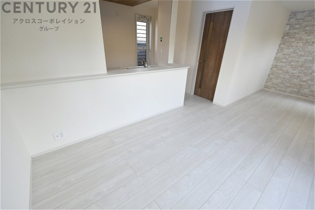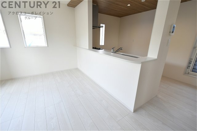 キッチン前のダイニングスペース カウンターキッチンから料理の受け渡し等に便利です。ダイニングセットを置いても十分な広さを確保。
