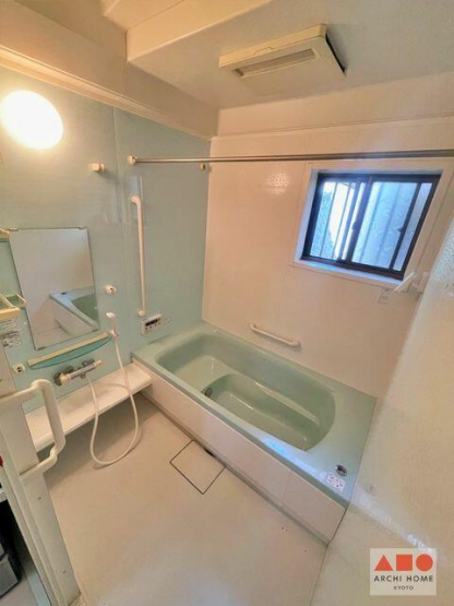 浴室暖房換気乾燥機付きの浴室。自動お湯張りもでき、浴槽にお湯