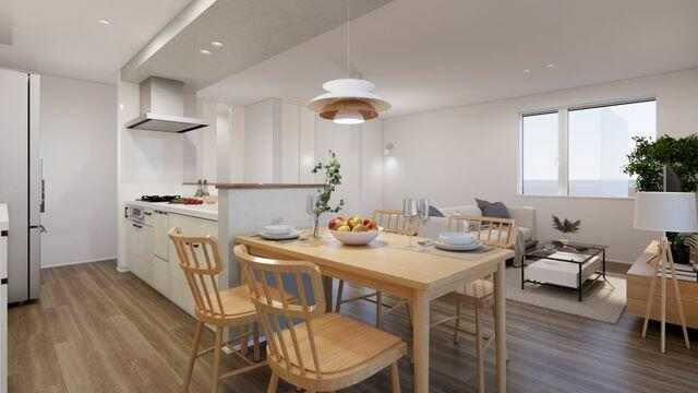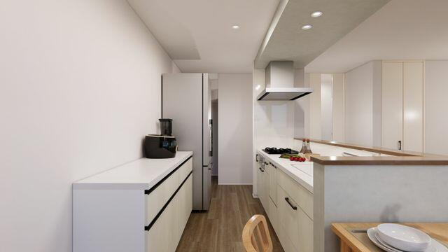 【A号地】キッチンとダイニングを横並びにすることで、配膳&片