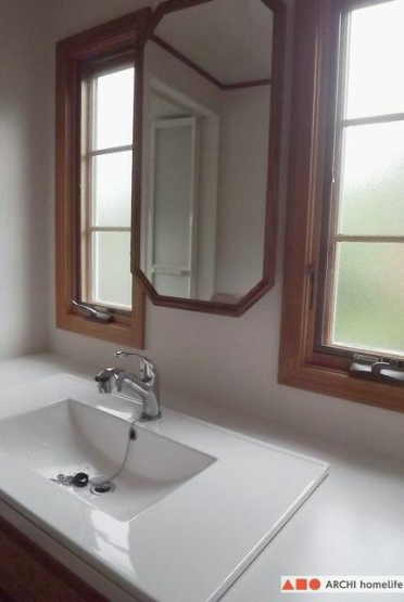 前面に窓があり、明るく清潔感漂う洗面。