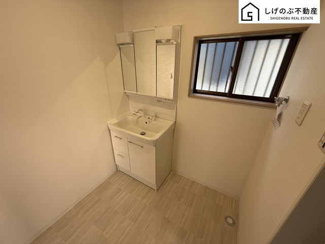 大きな三面鏡付きの洗面台で毎日の身だしなみもばっちりですね。